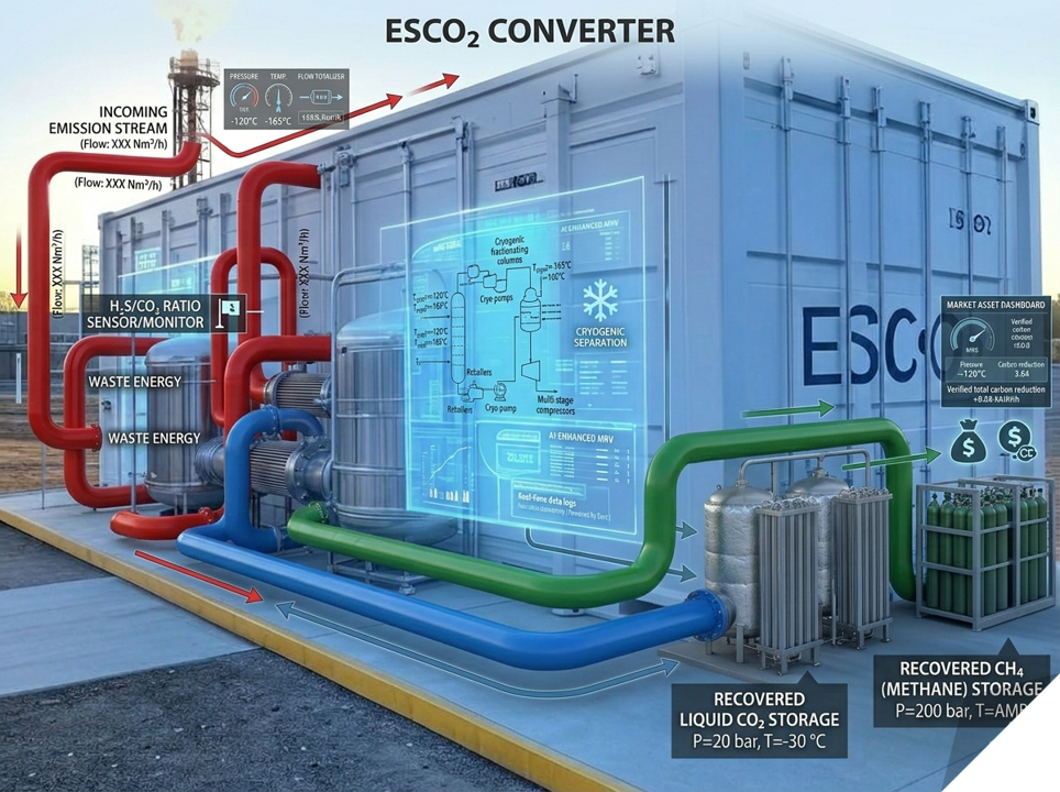 At the core of our offering is the ESCo2 Converter (ESC). A scalable, modular cryogenic refrigeration system that captures, cools, separates, and liquefies greenhouse gases. Powered by AI and quantum sensors, it delivers real-time optimization of gas composition and flow.